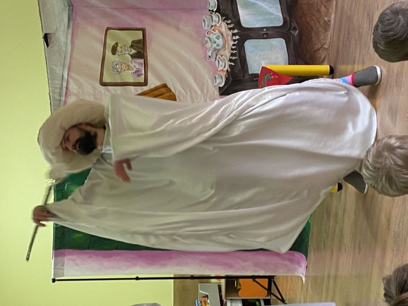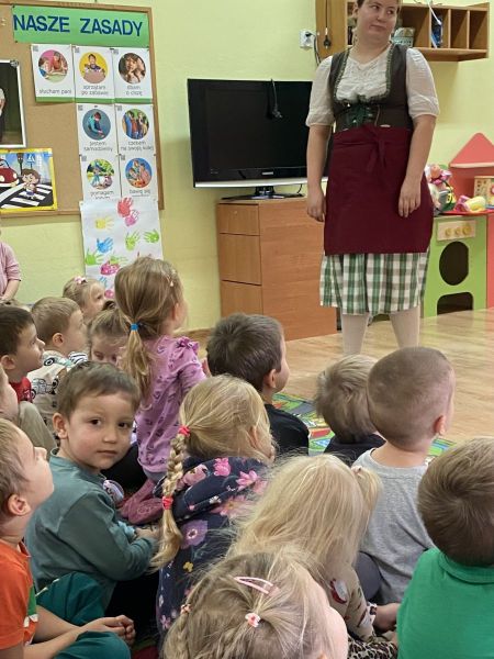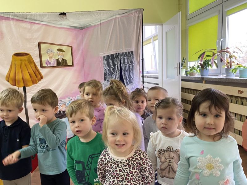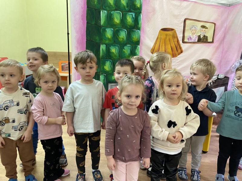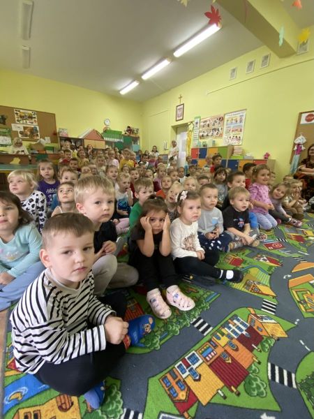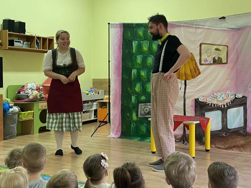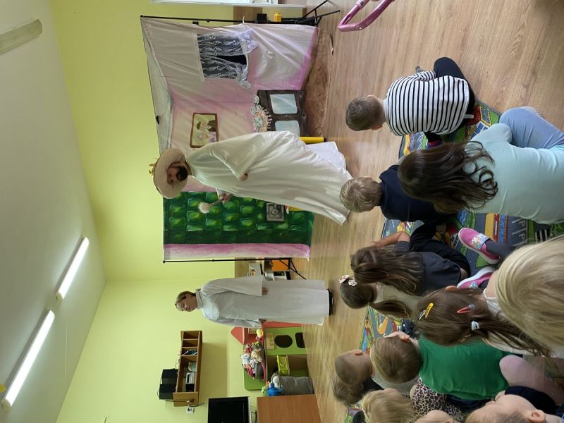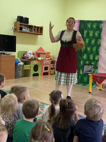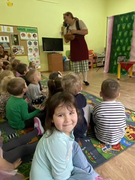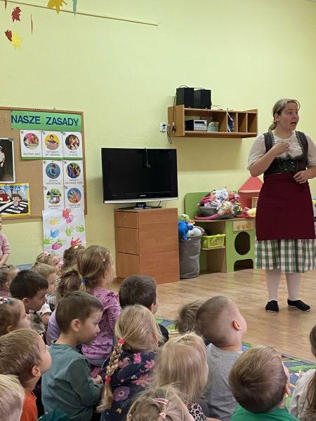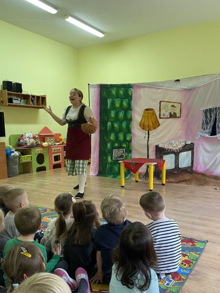 Z wielkim zainteresowaniem dzieci uczestniczyły w przedstawieniu teatralnym, podczas którego zapoznały się z twórczością J. Brzechwy. Reagowały śmiechem na przygody Pana Pomidora i ogrodniczki, Kłamczuszki która ciągle mówiła nieprawdę czy też Robaczka który wybrał się do miasta aby zjeść befsztyczek😀.