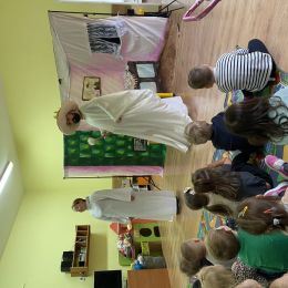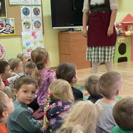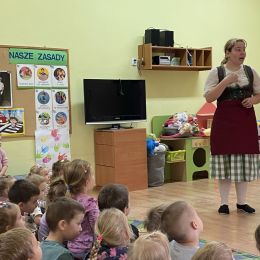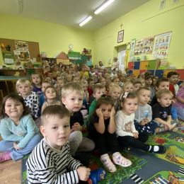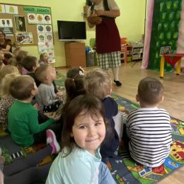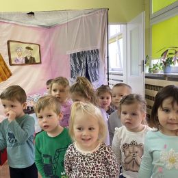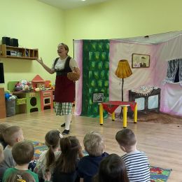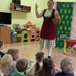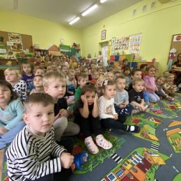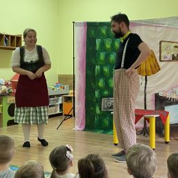 Z wielkim zainteresowaniem dzieci uczestniczyły w przedstawieniu teatralnym, podczas którego zapoznały się z twórczością J. Brzechwy. Reagowały śmiechem na przygody Pana Pomidora i ogrodniczki, Kłamczuszki która ciągle mówiła nieprawdę czy też Robaczka który wybrał się do miasta aby zjeść befsztyczek😀.